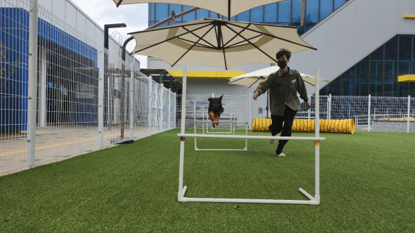 팀장님과 부팀장님이 어질리티장에서 훈련을 하고 있습니다.