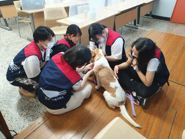 동물매개치료 수업 중인 학생들과 도우미견 유니